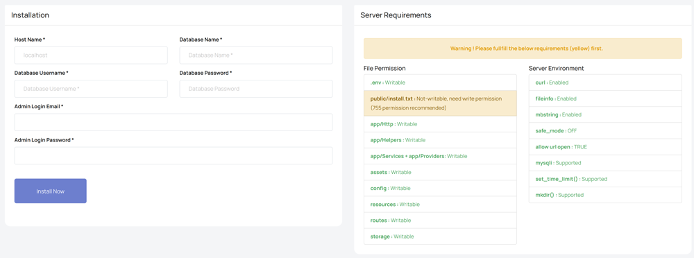 - If installation page appears again after you hit submit and processing done that means system could not delete public/install.txt and you have to delete that file manually.